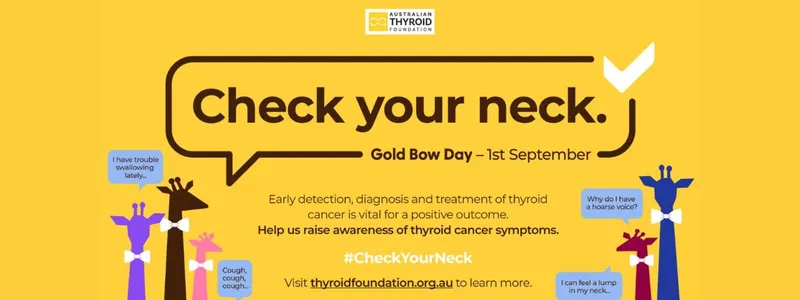 The Australian Thyroid Foundation’s Gold Bow Day raises awareness about the importance of being aware of symptoms and changes to your thyroid gland, which may be a result of thyroid cancer. This year’s message is #CheckYourNeck.